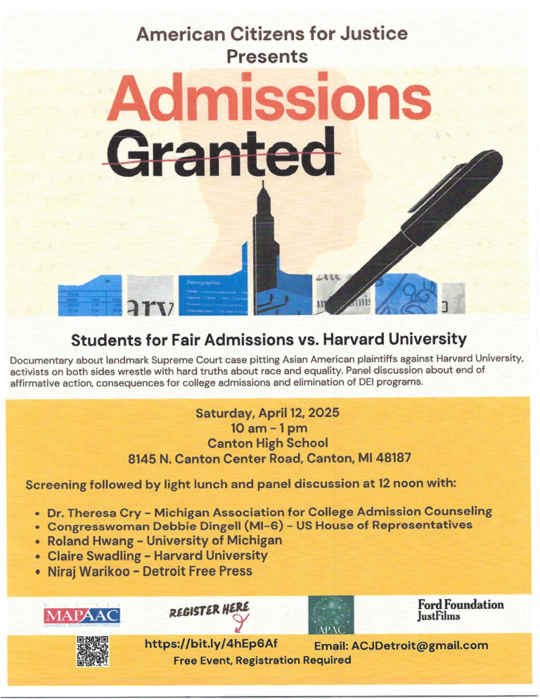 In a landmark Supreme Court case lawyer Ed Blum and some named Asian American plaintiffs sue Harvard University over its admissions policy. Affirmative action and college admissions processes hung in the balance. A panel addresses college admissions issues following the film screening. Sponsored by: American Citizens for Justice, Ford Foundation/Just Films, Michigan Asian Pacific American Affairs Commission, and the Asian Pacific American Club.